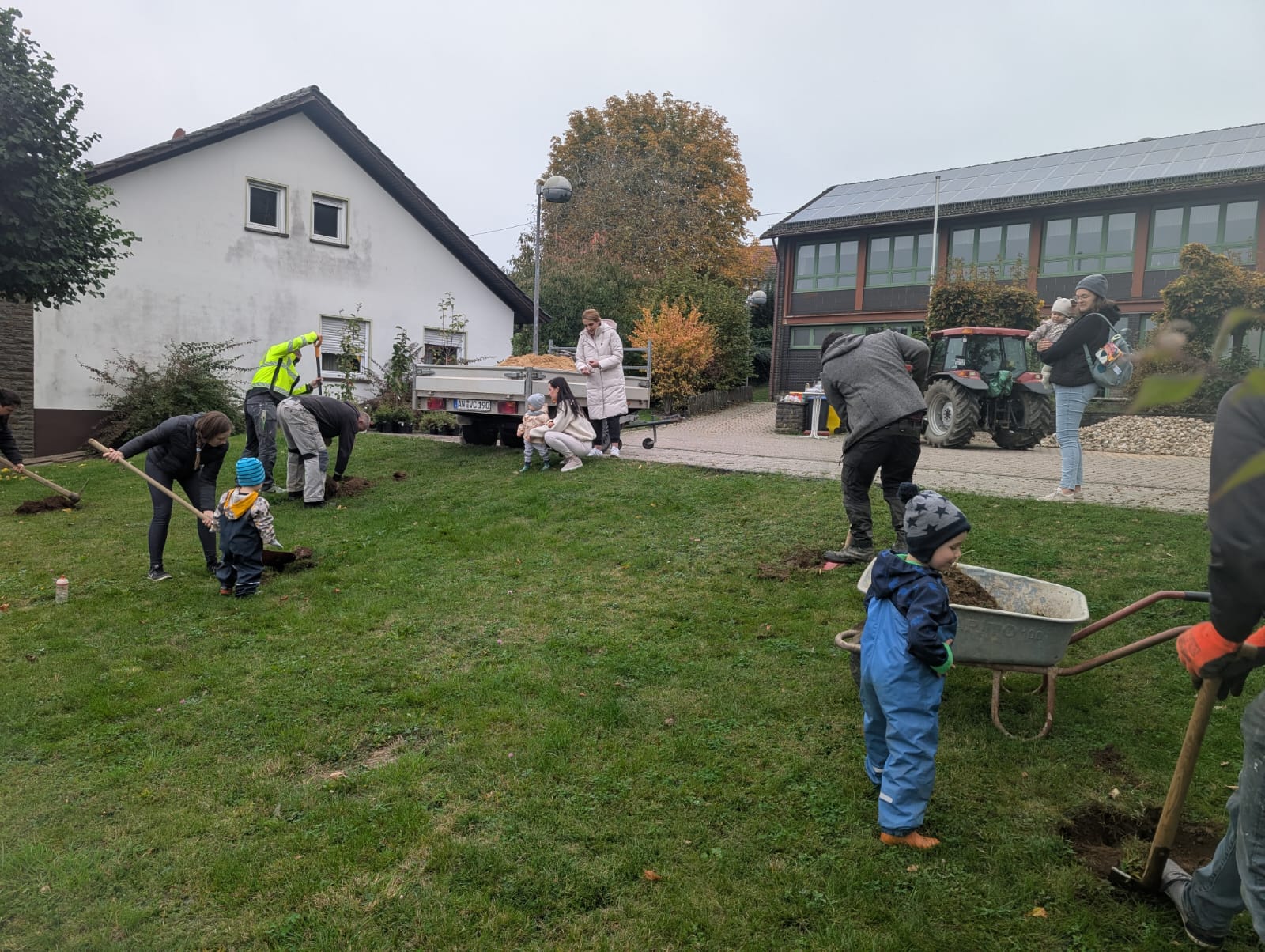 Bei der Premiere wurden sechs Obstbäume regionaler Sorten – Kirsche, Zwetsche, Mirabelle und Apfel – gepflanzt. Mit viel Engagement griffen Eltern, Kinder, Mitglieder des Gemeinderats sowie die ehrenamtliche Klimaschutzpatin gemeinsam zum Spaten. Bei bestem Herbstwetter entstand so nicht nur eine kleine Obstwiese, sondern auch ein schönes Gemeinschaftserlebnis.